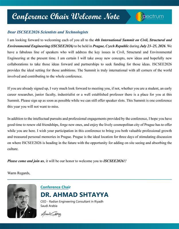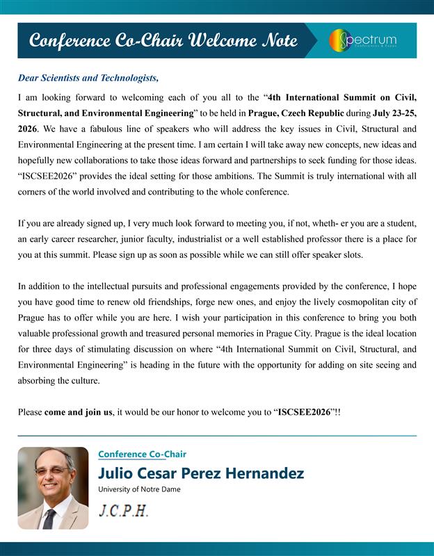 We are pleased to welcome all the researchers in the field of Civil Engineering to the "4th Series of International Summit on Civil, Structural and Environmental Engineering" (ISCSEE2026), which will be held in Prague, Czech Republic during July 23-25, 2026.
